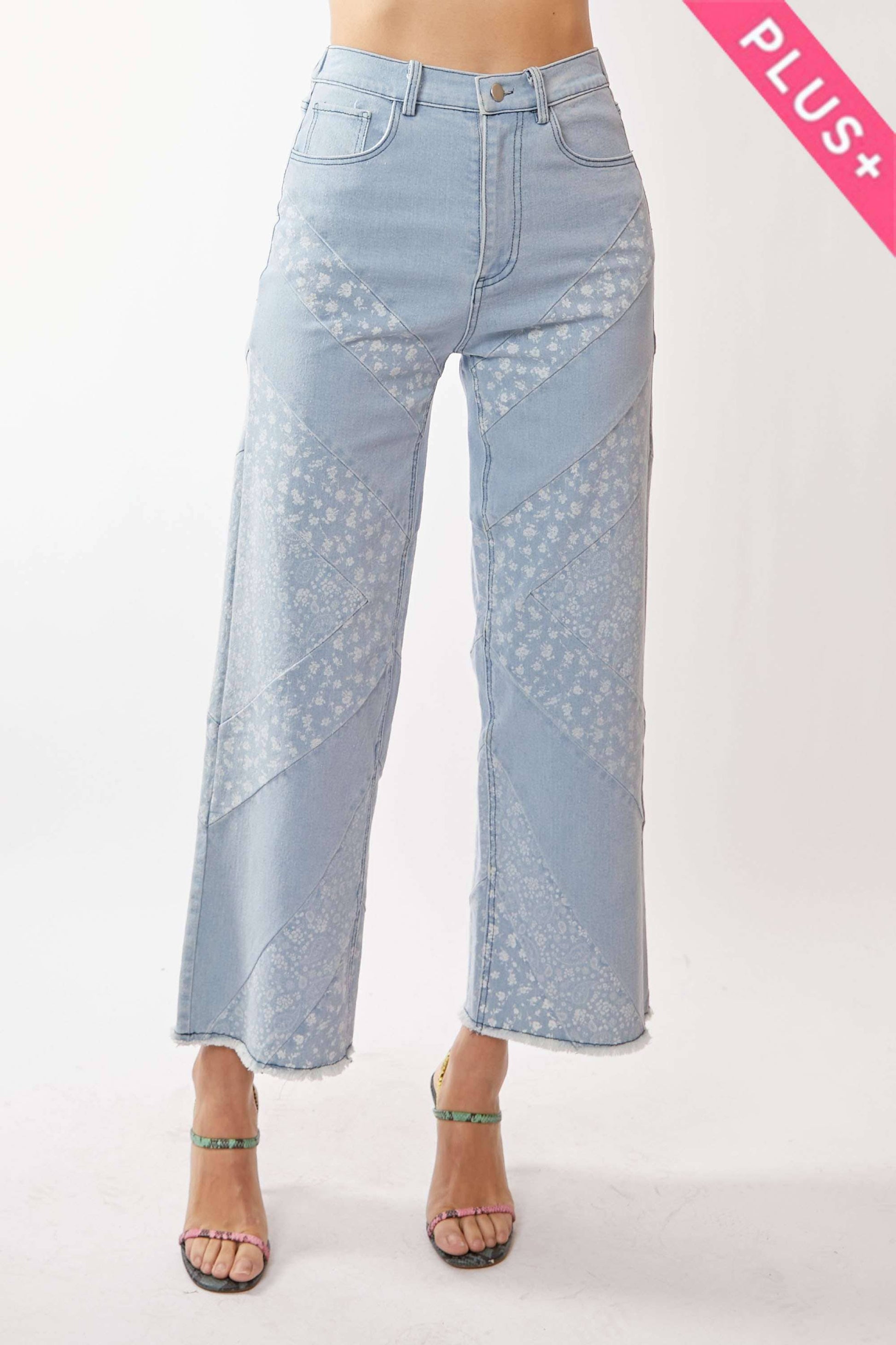 PLUS WIDE OPENING DENIM SLIGHTLY STRETCH PANTS WITH CONTRAST FABRICATION THROUGHOUT THE GARMENT OF DITSY FLORAL AND PAISLEY PRINT AND FINISHED WITH RAW EDGE ON HEM